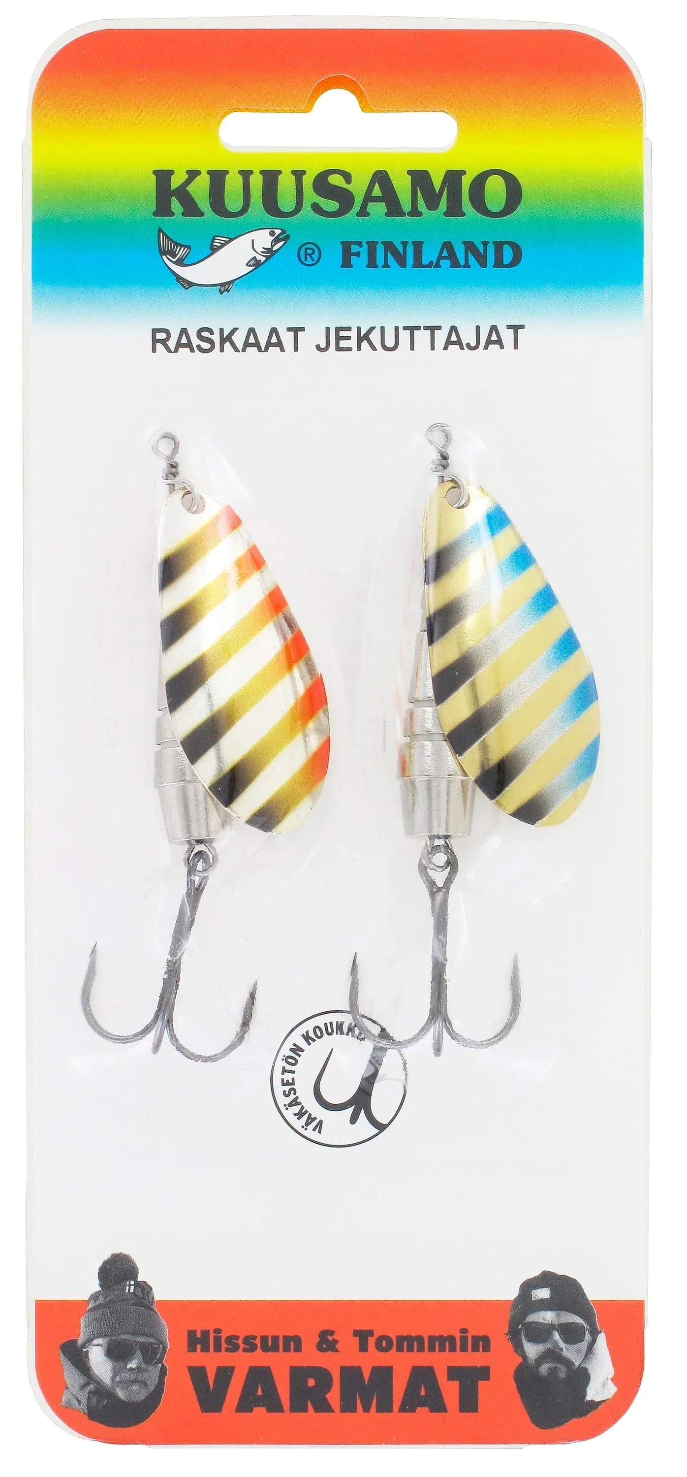 The color scheme for this set has been designed by the reknown fishing duo Kari "Hissu" Hietalahti and Tommi Korpela, who have selected their favorite colors for sea and lake fishing with Kuusamo's classic Taimen spoon.